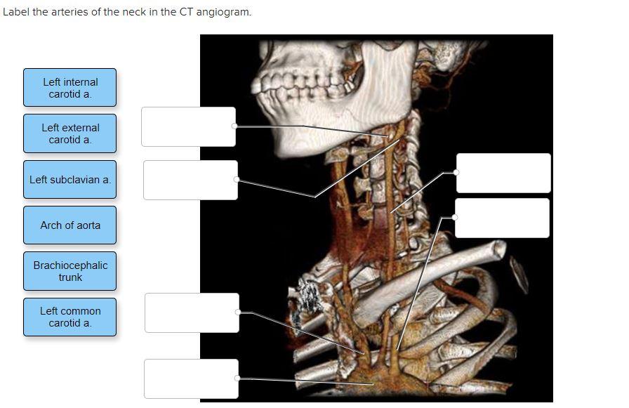 Left internal carotid a. CT angiography CTA evaluates the major vessels of the head neck or both. Label the blood vessels and structures using the hints provided.